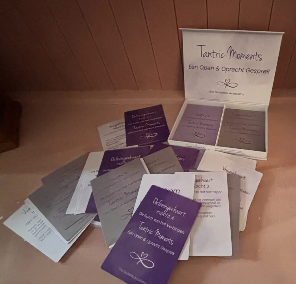 Kaartenset met vragen en oefeningen die je helpen om diepere gesprekken en echte verbinding te creëren. Voor stellen, vrienden of jezelf.